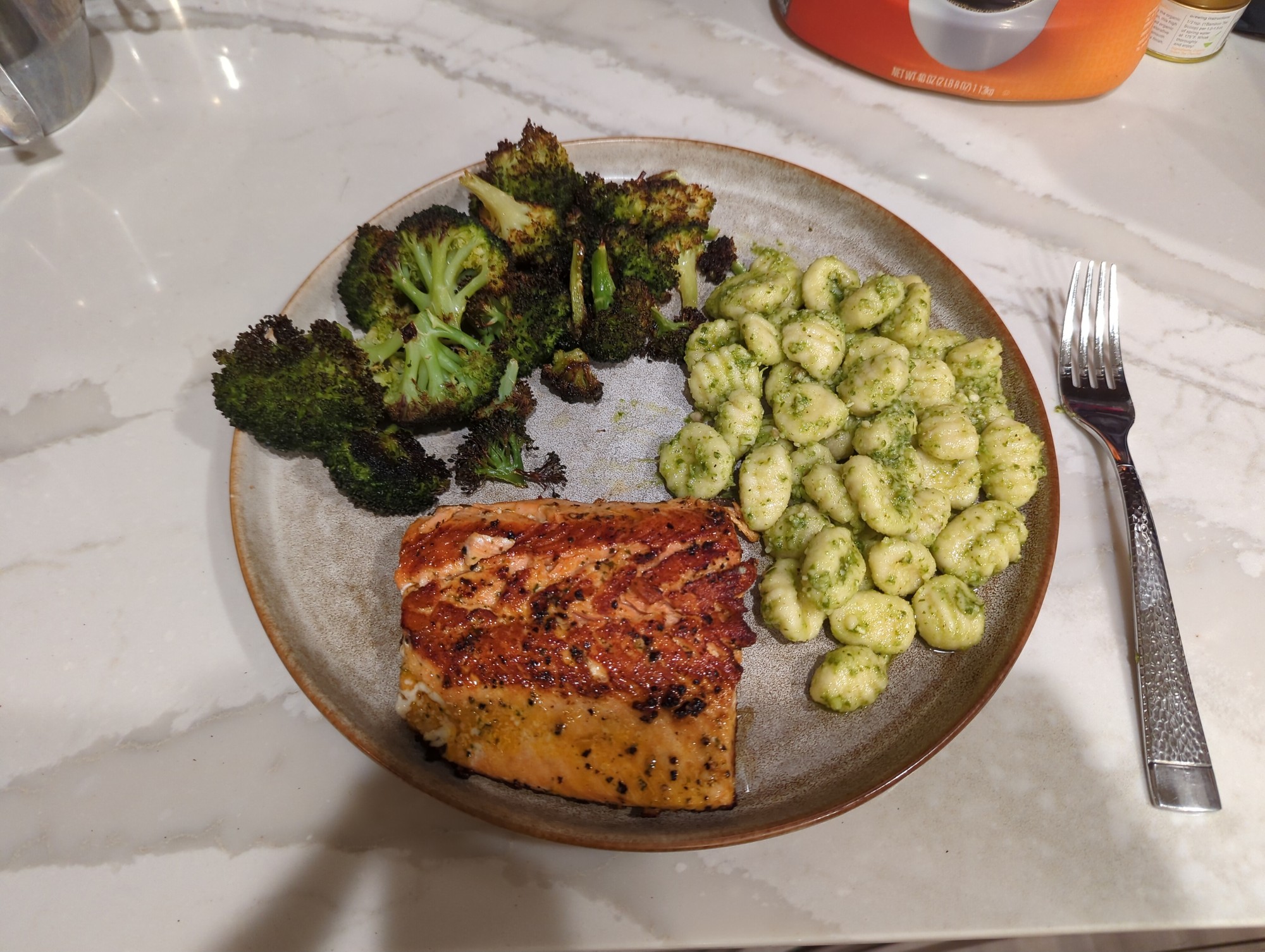 altr Lemon pepper salmon steak, roasted broccoli, and gnocchi in basil pesto.